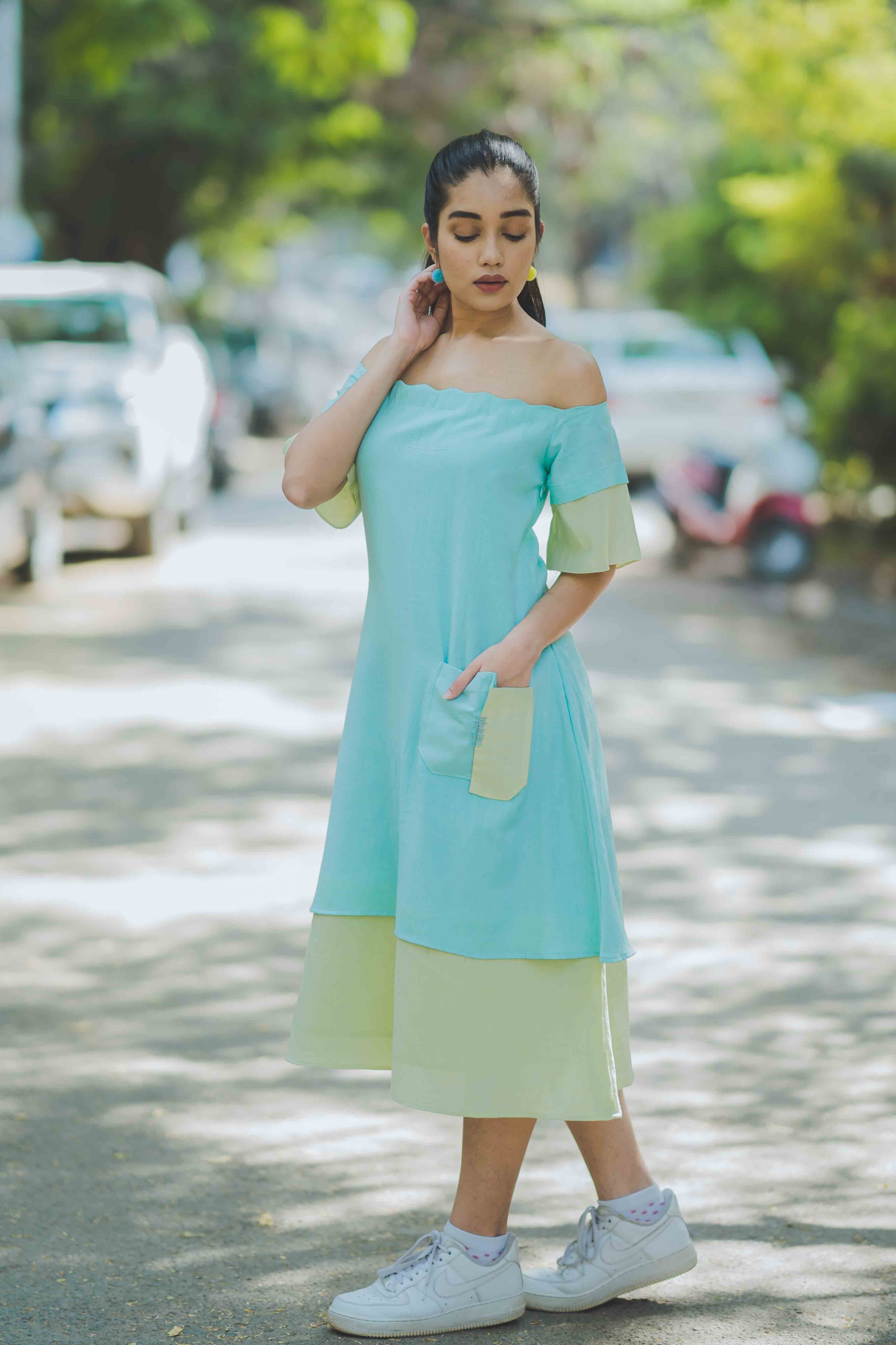 Blue Yellow Calf length dress comes with off shoulder and stylish pocket. Perfect and chic for summer days. Comfortable clothing. Brighten your day with this colorful outfit and rock your way.