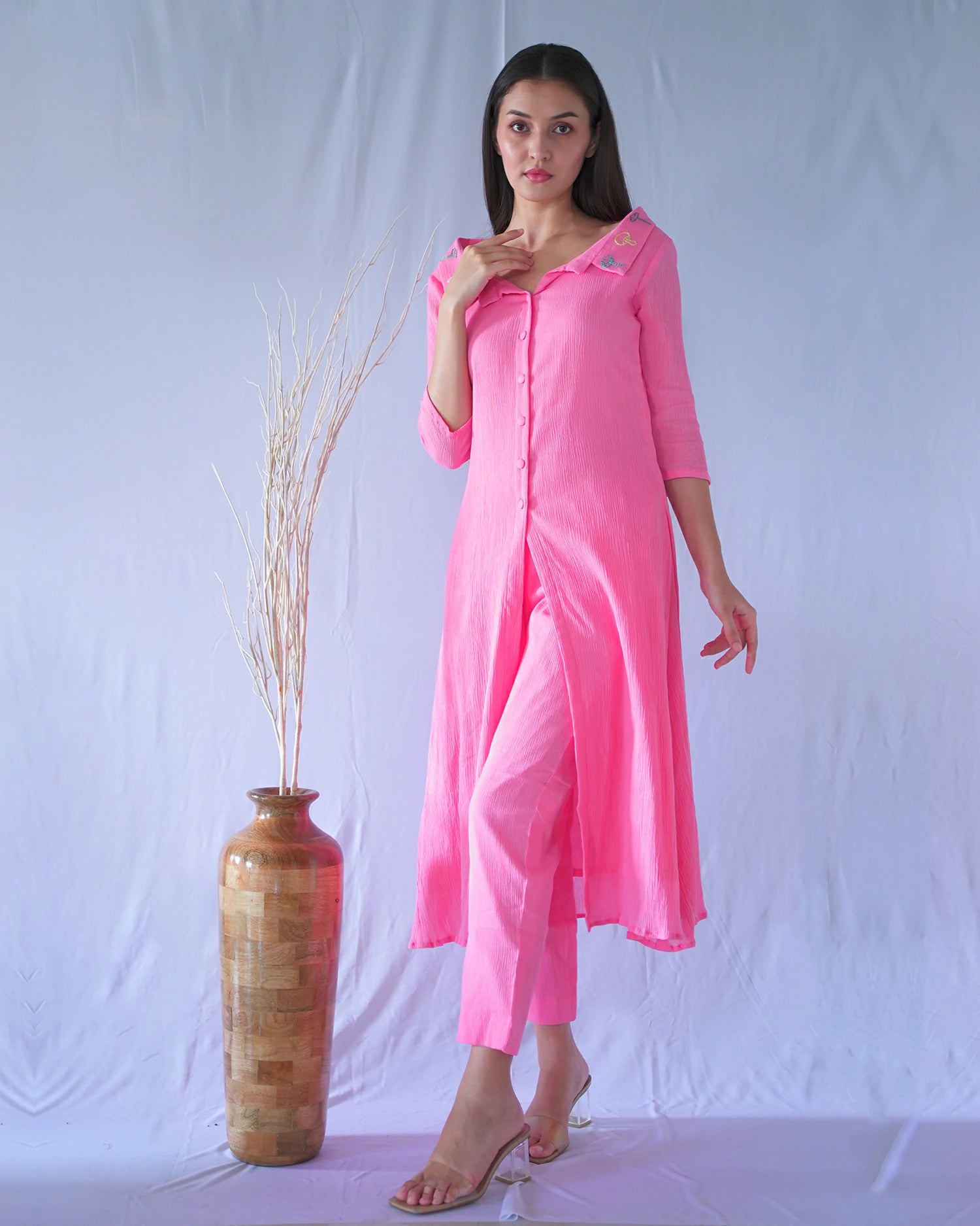 Here’s a pink co-ord with a detailed off-shoulder collar with mushroom motifs, a button-down top with a middle slit and is paired with cigarette pants. A cheerful candy color in contemporary style.