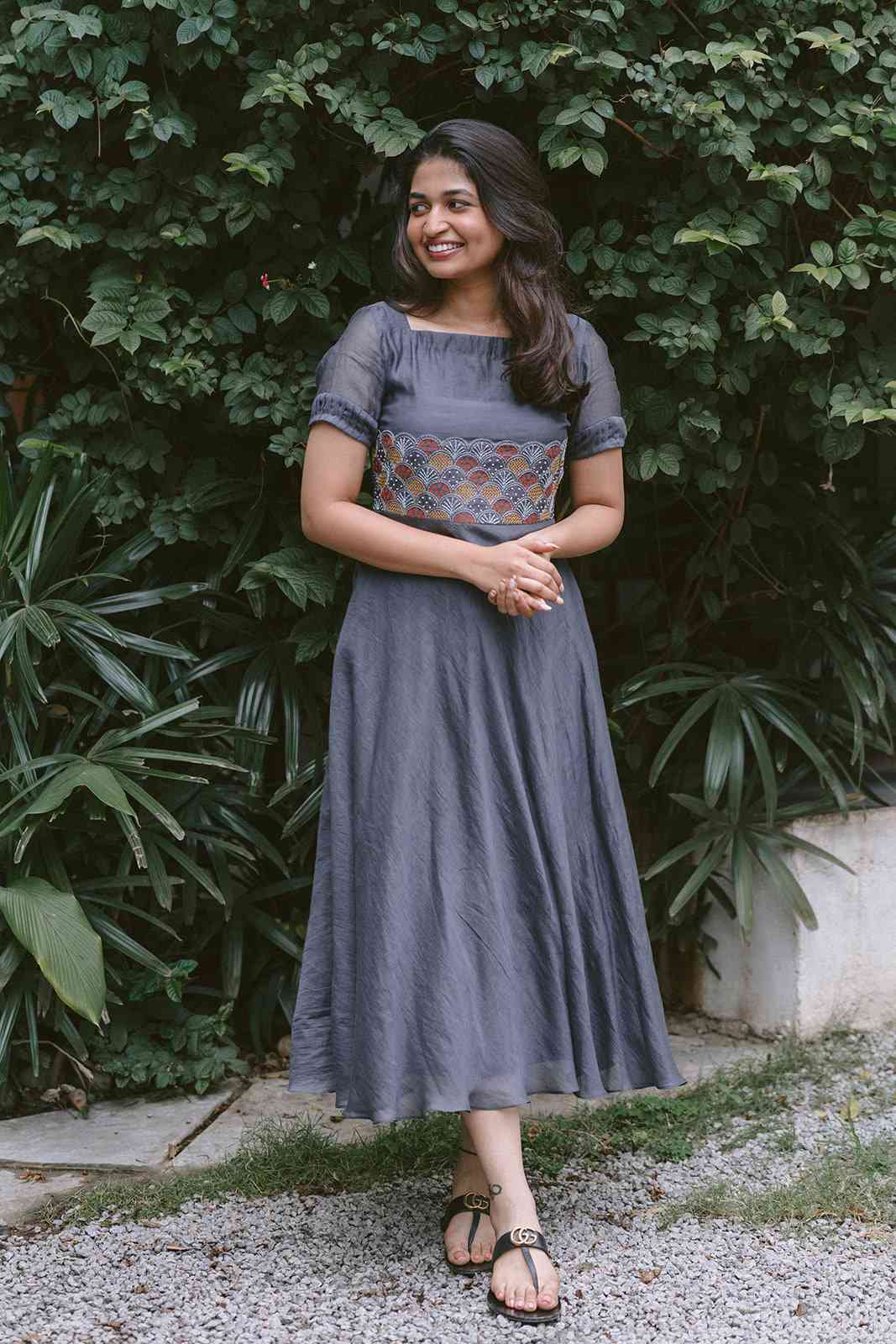 Grey Scallop Blossoms 2.0 Chanderi Calf_Length Dress