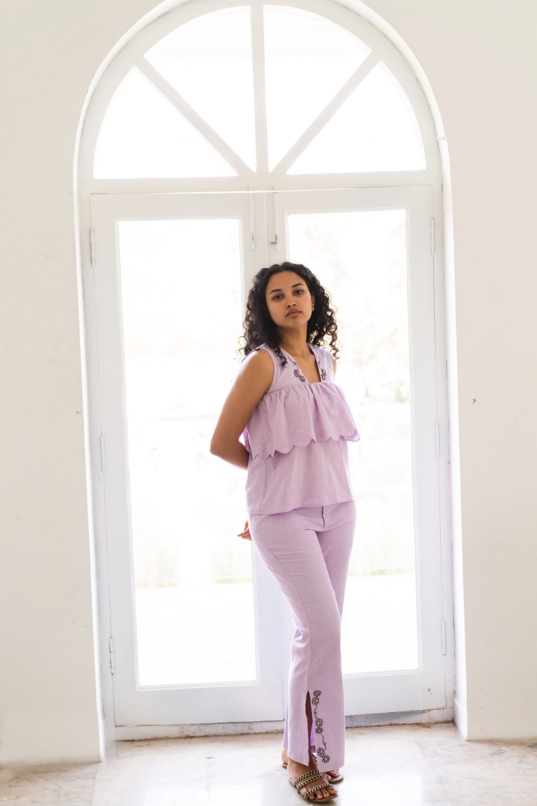 Embrace summer elegance with our LILADEW Co-ord set in a serene Lilac hue. The outfit features a beautifully gathered body with delicate scallop detailing, paired with wide-leg slit pants for a breezy, graceful look. Perfect for those who adore a blend of comfort and style.