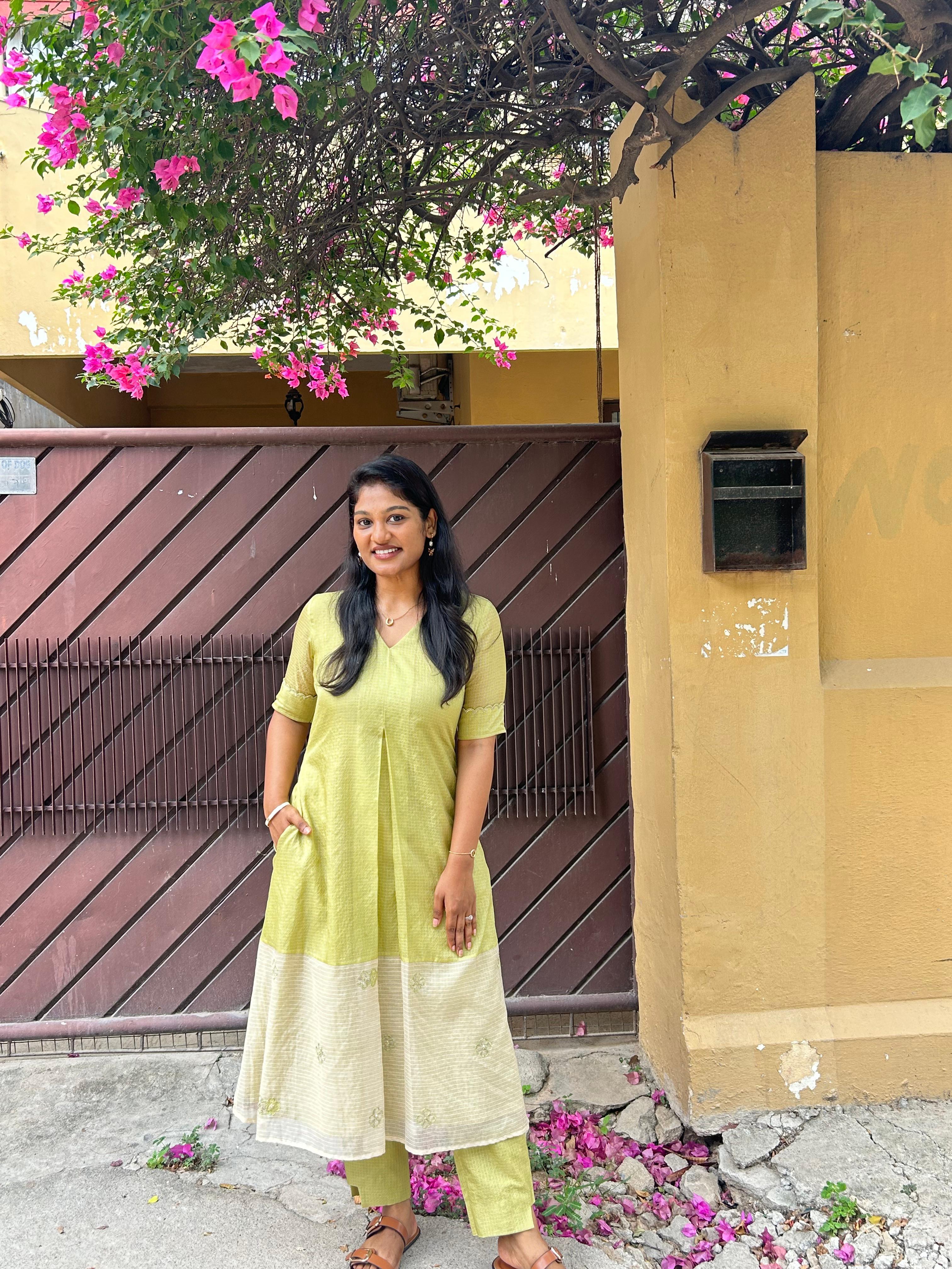 Flowing lines, delicate floral appliqué, and the softest shade of calm come together in this effortlessly elegant silhouette. Designed for comfort and grace, this dress moves with you, perfect for days that call for ease and understated charm.