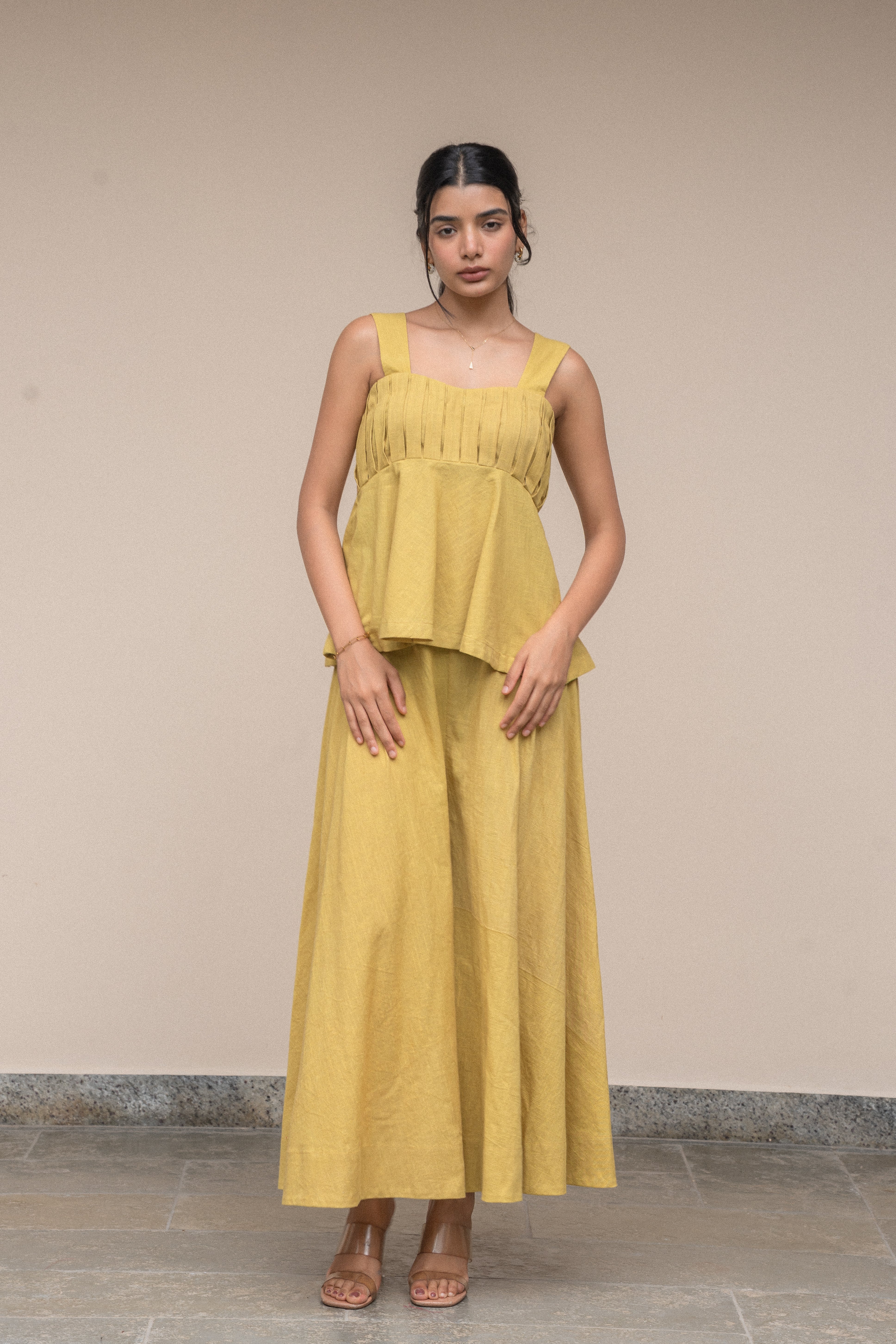 This breezy mustard co-ord set, has a top that features broad straps and a pleated bustier, creating a flattering silhouette. Paired with wide-flared palazzo pants, this ensemble offers a perfect blend of structure and ease.