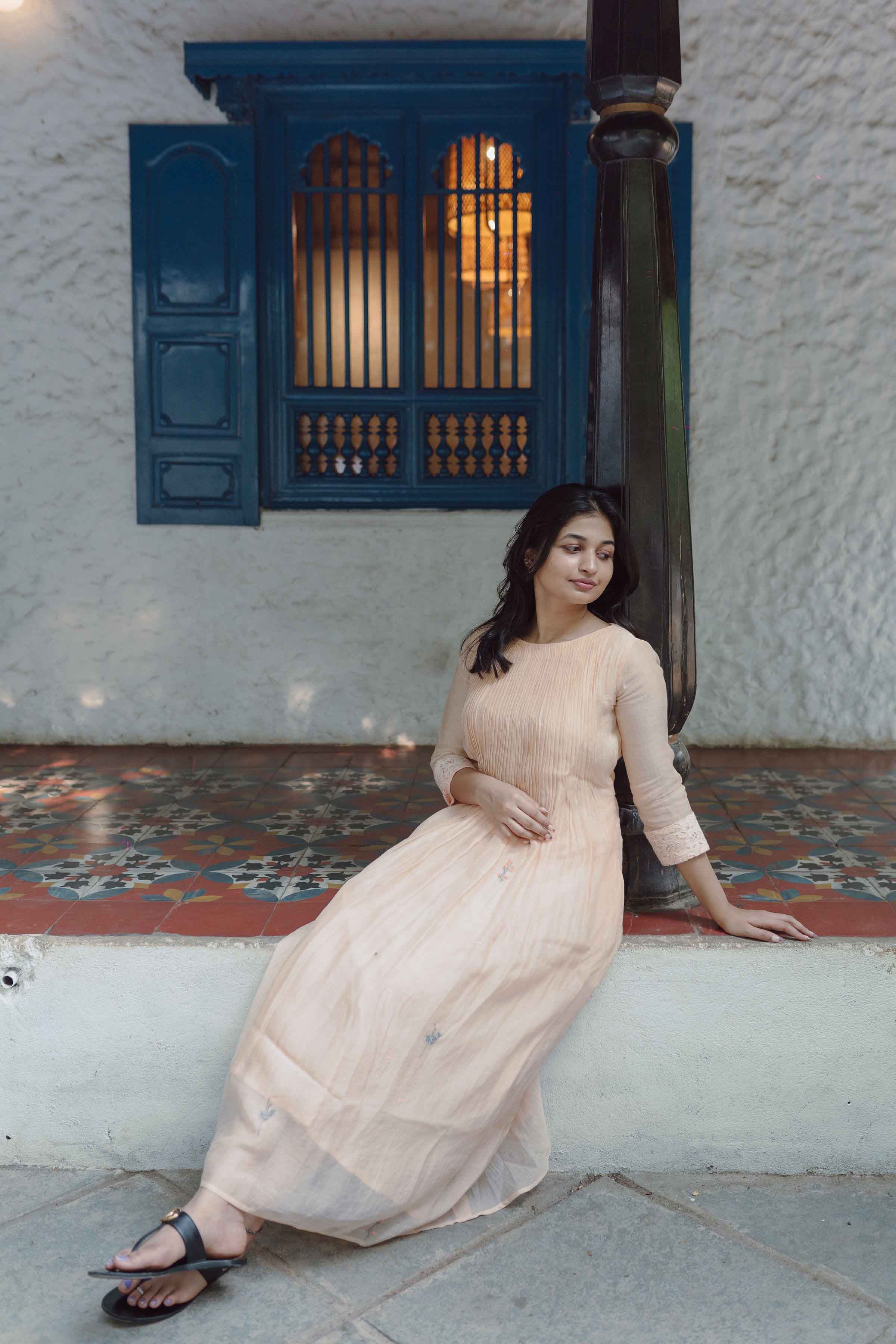 Salmon Colour Blossoms Calf Length Dress With 3/4th Sleeves