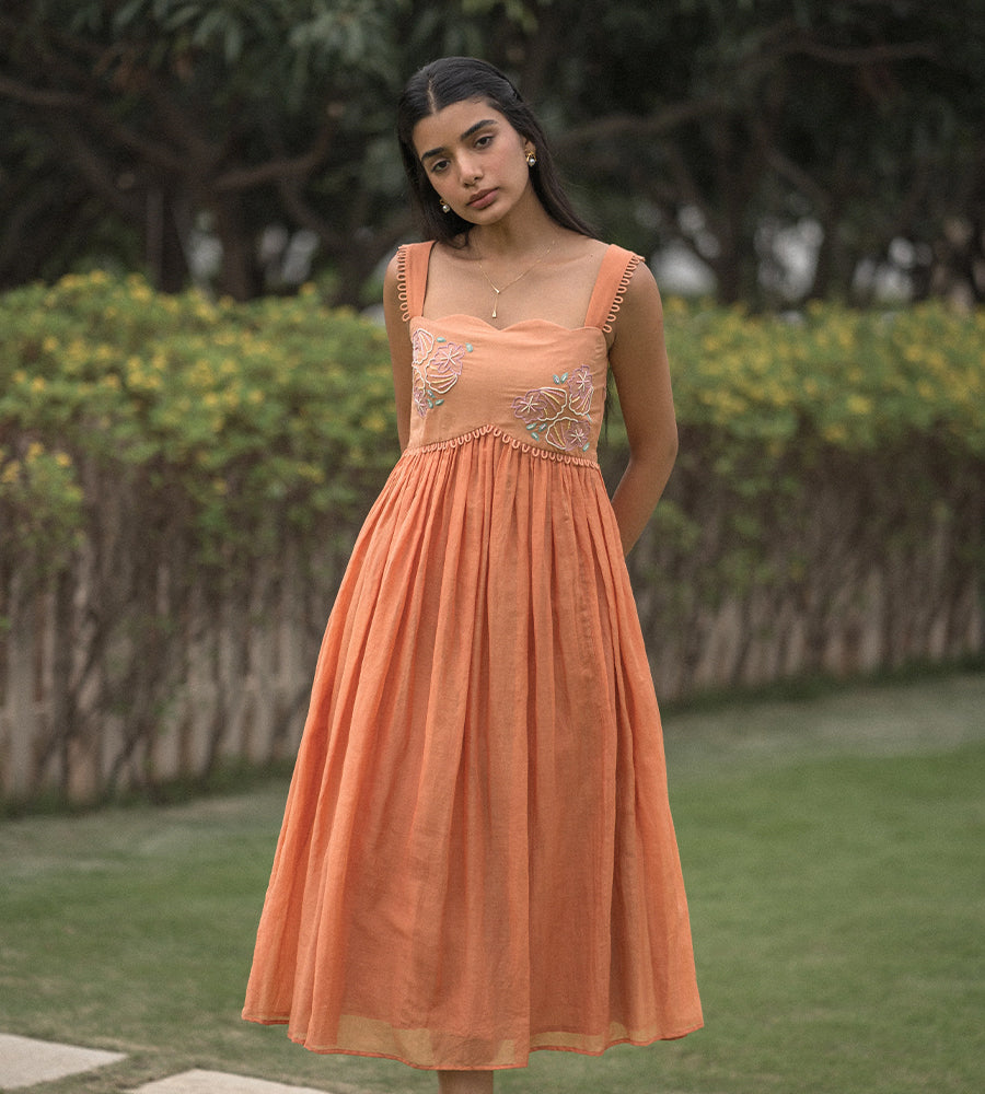 This calf-length beauty features a soft, earthy orange hue reminiscent of a summer sunset. Delicate scallop loops trace the straps while the front neck is gently structured with subtle pleats and floral embroidery that evoke seashell patterns.